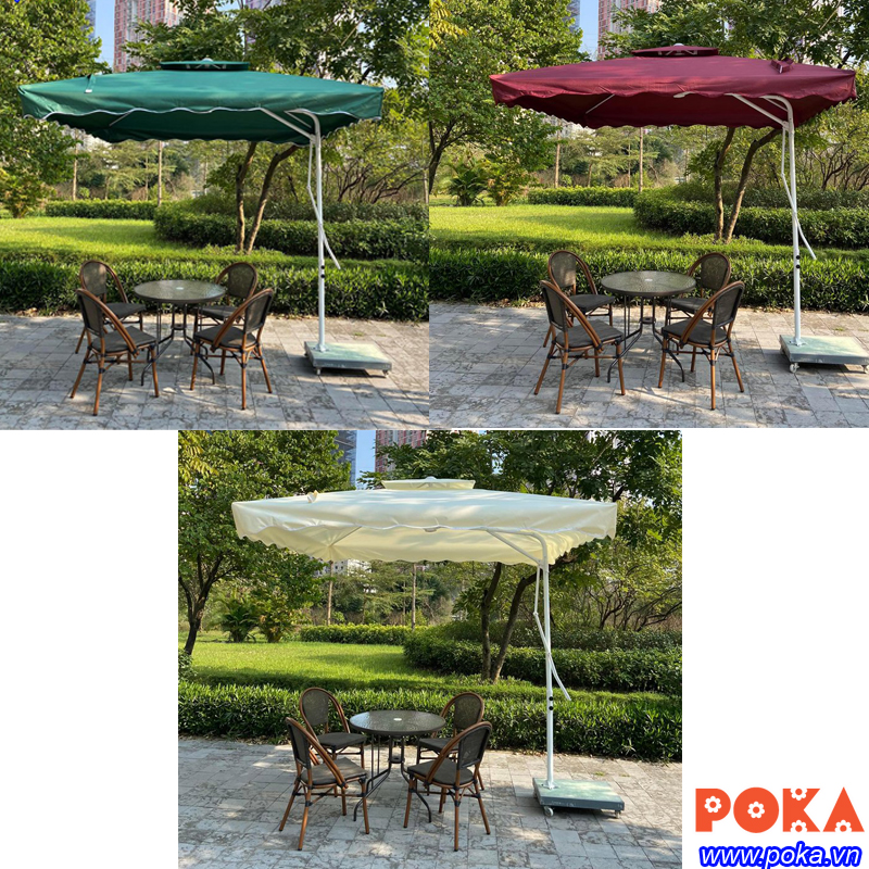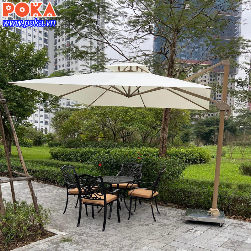 Với thời tiết thất thường ở cả 3 miền bắc, trung, nam thì sân vườn của nhà Bạn không thể thiếu được một chiếc ô dù lệch tâm nhôm vuông 3mx3m. Với chiếc ô này thì Bạn hoàn toàn có thê yên tâm khi thưởng thức một buổi sáng chọn vẹn bên ly trà, cà phê mà không lo chở ngại về nắng mưa.