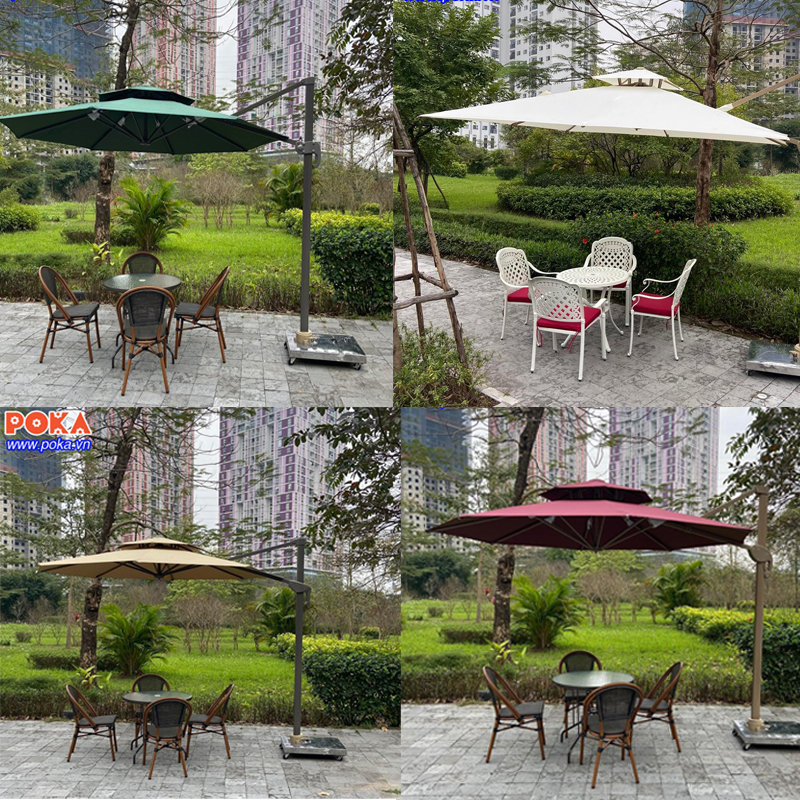 Ngoài ra với chiếc ô dù lệch tâm tròn nhôm đườn kính 3m màu sắc sặc sỡ cũng là một điểm nhấn rất riêng cho ngôi nhà sân vườn, quán cà phê, nhà hàng, resort, khách sạn của Bạn.