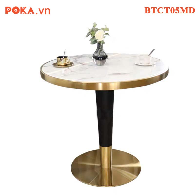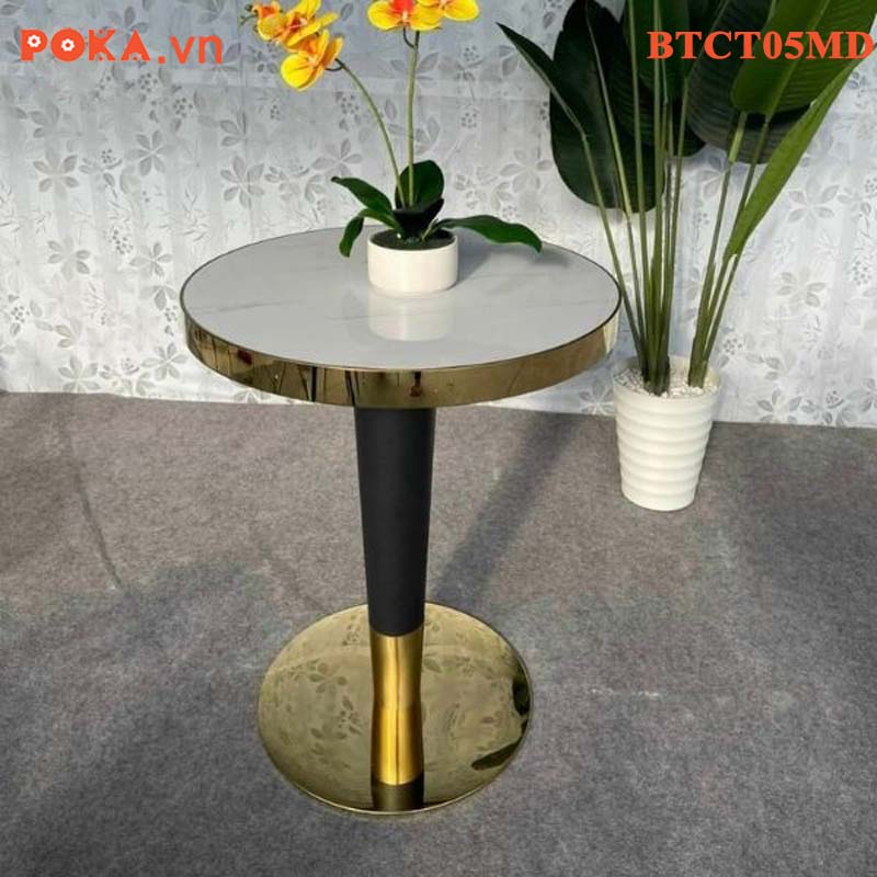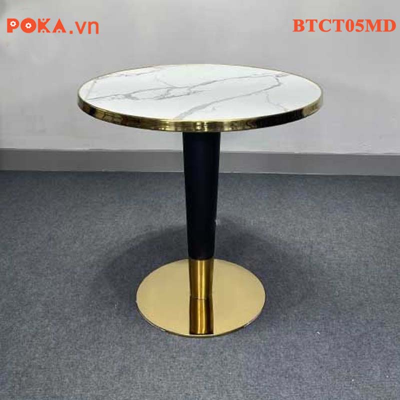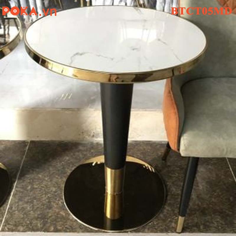 Bàn Cafe Cao Cấp trụ tròn mạ vàng mặt gỗ bọc viền vàng BTCT05MD