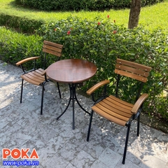 - Chất liệu: Gỗ Acacia trên 10 năm tuổi không mấu mắt, độ ẩm < 14%, được phủ dầu chống nước. Sắt ống tròn đường kính 21mm, dày 1.2mm, sơn tính điện màu đen bóng.