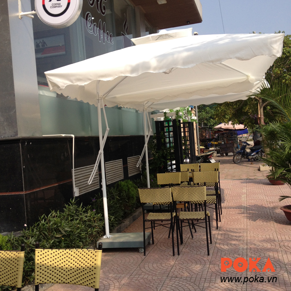 Và để tạo thêm điểm nhấn cho không gian quán, Poka có tư vấn thêm về sản phẩm ô lệch tâm vuông 2.5x2.5m vừa giúp che nắng, che mưa cho khách cũng như tăng tuổi thọ bàn ghế fansipan hơn. Thân ô dù làm bằng thép sơn tĩnh điện tuyệt đẹp. Áo dù làm bằng vải tráng PU, không bị thấm nước khi trời mưa, Ô dù lệch tâm vuông có tay đòn bẩy điều chỉnh độ mở rộng của ô.