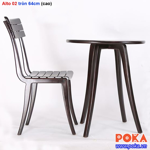 Bàn ghế cafe bằng gỗ ngoài trời Alto 02 loại cao với dáng vẻ uốn cong mềm mại, chắc chắn. Bề mặt gỗ được sơn bóng pu có tác dụng không những chống thấm nước 100% mà còn tôn lên màu sắc và vân tự nhiên của gỗ. Chân ghế bằng gỗ được thiết kế vững chãi về kết cấu nhưng không thiếu đi sự mềm mại trong thẩm mỹ.