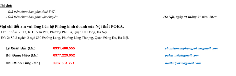 Kính gửi Qúy Khách Hàng, Chân bàn Poka xin gửi tới Qúy Khách Hàng bảng báo giá bán lẻ tổng hợp các mẫu chân bàn văn phòng để cho quý khách tiện theo dõi và tham khảo. Để được báo giá chi tiết cũng như mức triết khấu dành cho các xưởng nội thất, công ty kiến trúc, những đại lý có nhu cầu hợp tác lâu dài với khung bàn văn phòng Poka xin vui lòng liên hệ Hotline: 0977.22.99.52 để được hỗ trợ nhanh nhất. Ngoài các mẫu chân bàn theo kích thước tiêu chuẩn, Chúng tôi còn nhận gia công chân bàn văn phòng (khung bàn văn phòng) theo bản vẽ thiết kế. Rất mong được hợp tác cùng Qúy Khách.