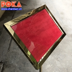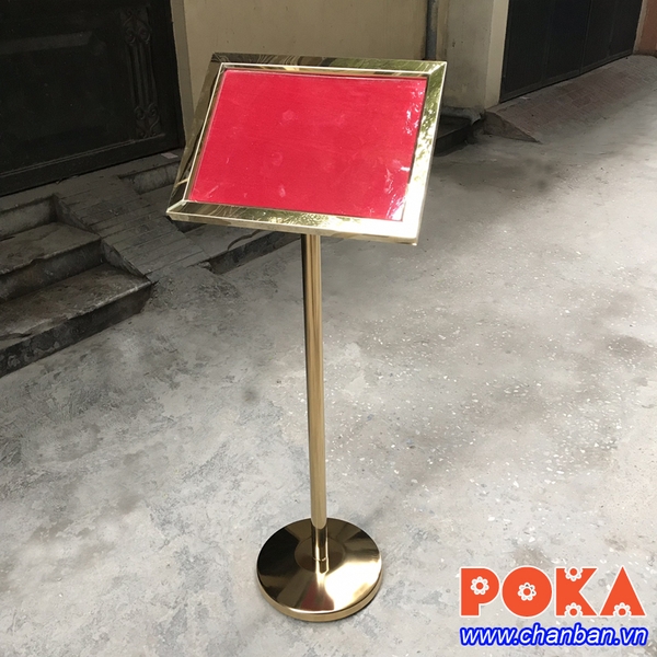 Bảng chỉ dẫn khách sạn menu A3 inox màu vàng thường được dùng trong hội nghị, sự kiện, tiệc cưới hỏi mục đích để hướng dẫn khách mời hoặc thăm quan biết lối vào bên trong, thực đơn nhà hàng hôm nay có những món gì, tên cô dâu chú rể...