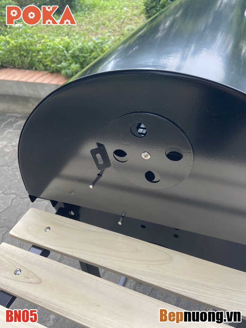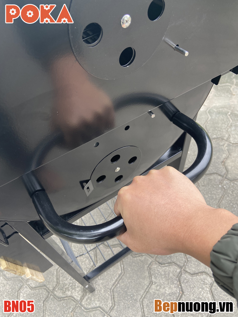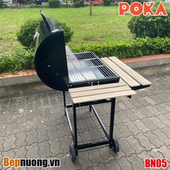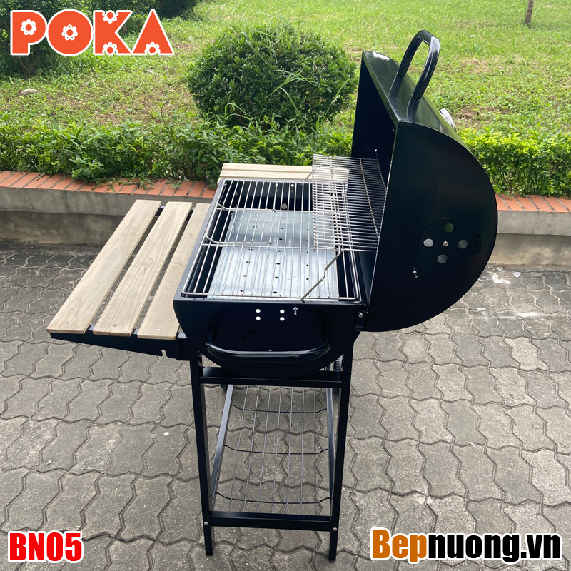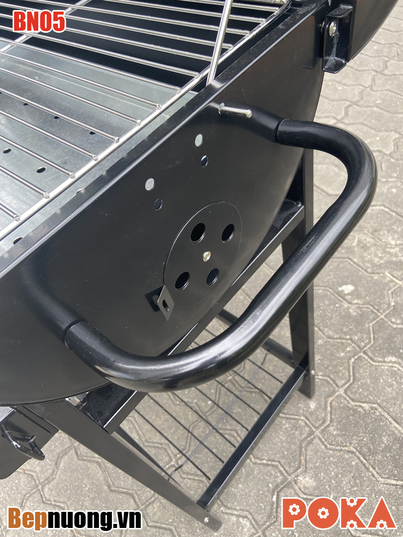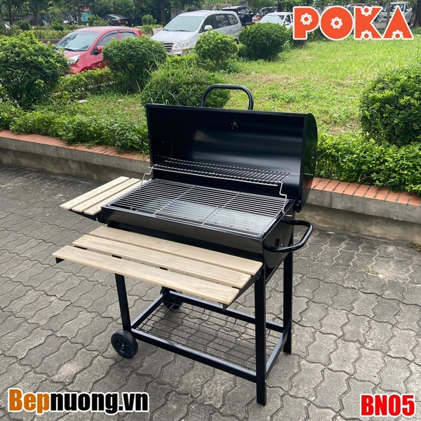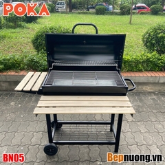 Bếp nướng than hoa BBQ BN05 là có nắp đậy giúp giữ nhiệt làm chín thức ăn nhanh hơn, có thể om giòn hoặc nướng thịt miếng tảng. Bếp nướng BN05 có phần giá đỡ ở phía trước và bên hông dùng để thực phẩm. Có bánh xe giúp dễ dàng khi di chuyển.