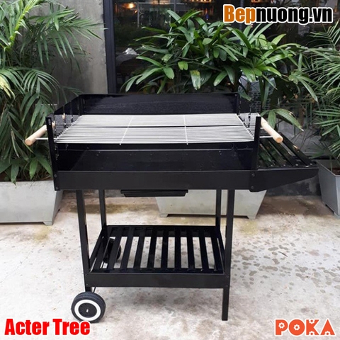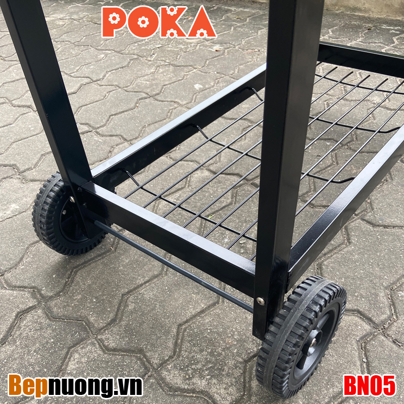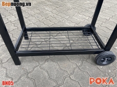 Bếp nướng BN05 có phần giá đỡ ở phía trước và bên hông dùng để thực phẩm. Có bánh xe giúp dễ dàng khi di chuyển.