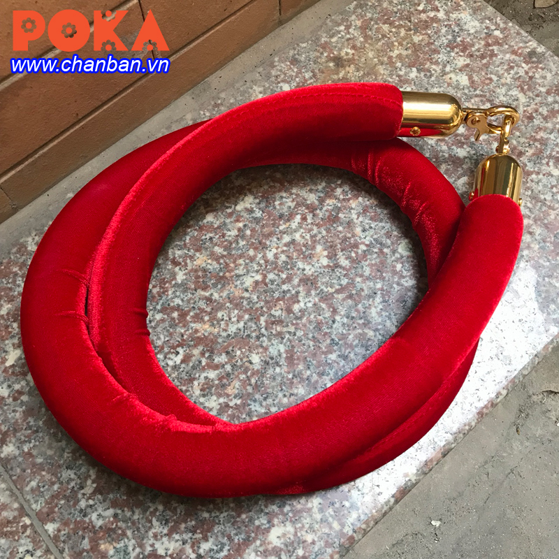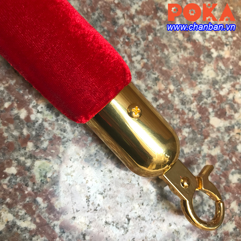 Dây nhung đỏ có móc khóa inox màu vàng thường dùng với cột hàng rào chắn inox ở trong khách sạn, nhà hàng hoặc khu nhà ga sân bay, viện bảo tàng, rạp chiếu phim, chung cư...