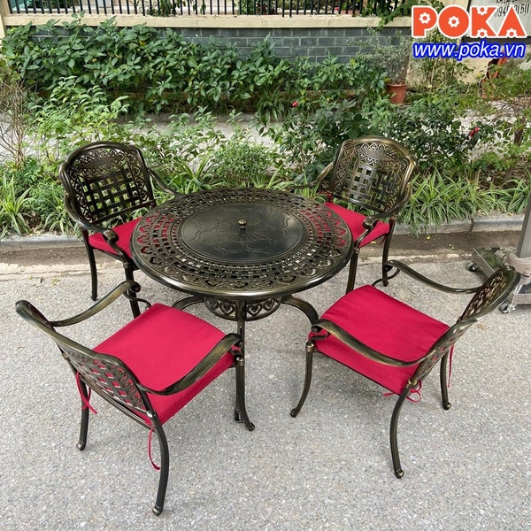 Rất phù hợp những bữa tiệc BBQ ngoài trời sân vườn. Toàn bộ khung bàn và ghế được thiết kế từ hợp kim nhôm đúc sơn tĩnh điện vô cùng chắc chắn, bền bỉ theo thời gian. Mặt bàn được làm từ đá nhập khẩu nguyên khối có khả năng chịu nhiệt cao.