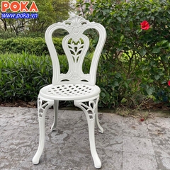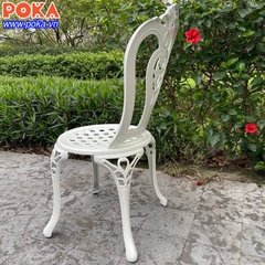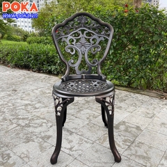 Một bộ bàn ghế nhôm đúc với các đường cong mềm mại như hòa mình vào cỏ cây hoa lá, họa tiết tuy đơn giản nhưng vẫn toát lên sự tinh tế và sang trọng.