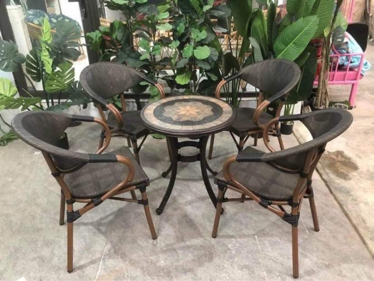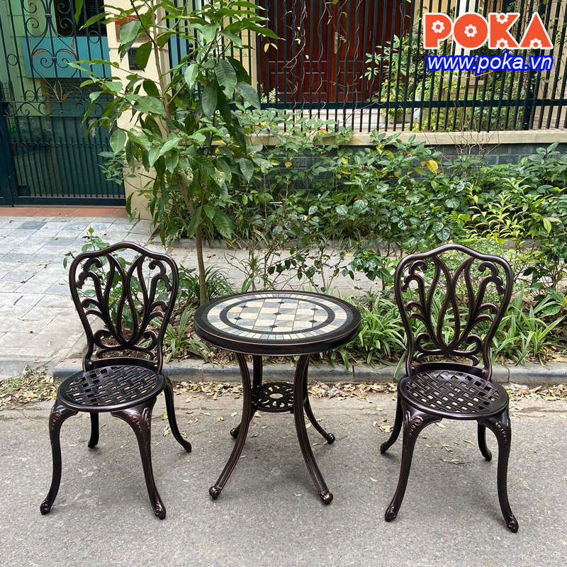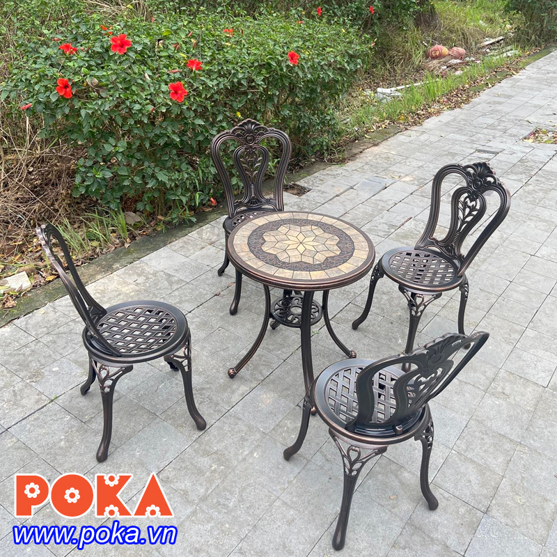 Với kích thước mặt bàn đường kính 60cm khá nhỏ gọn nên phối hợp với các mẫu ghế nhôm đúc không tay họa tiết hoa sen, hoa lan hoặc caro.