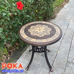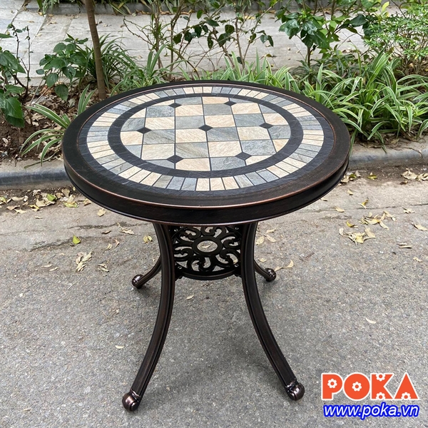 Bàn nhôm đúc tròn 60cm kết hợp giữa 2 chất liệu là hợp kim nhôm đúc và đá mosaic nghệ thuật tạo nên một sản phẩm hài hòa giữa nét cổ kính và đương đại.