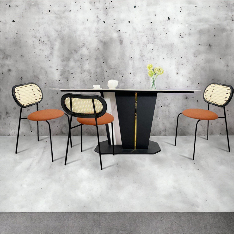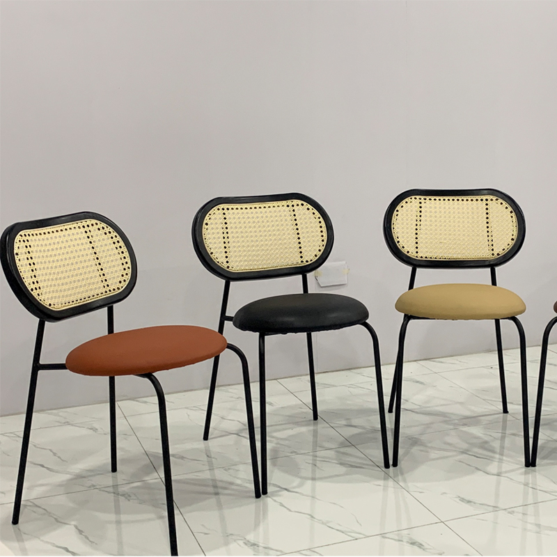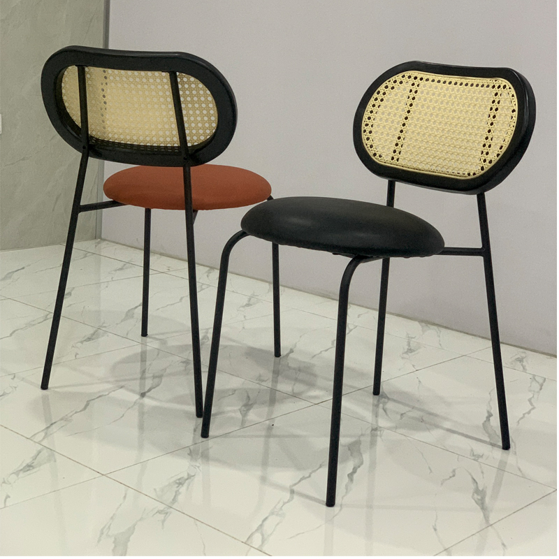 - Chất liệu: Tựa ghế gỗ ash sơn đen mờ, mặt tựa mây lưới, đệm bọc da (vải), khung thép sơn tĩnh điện đen