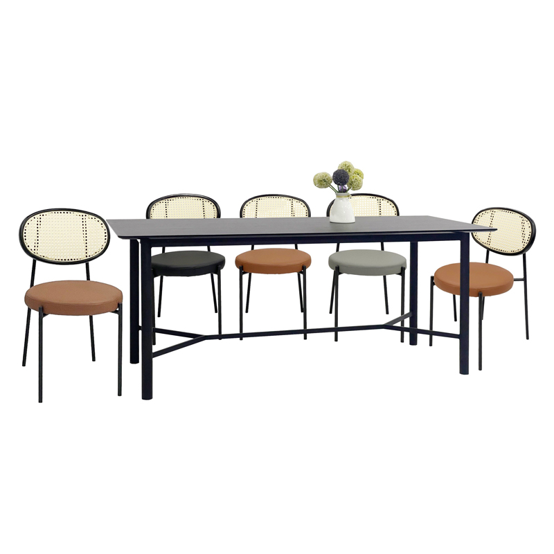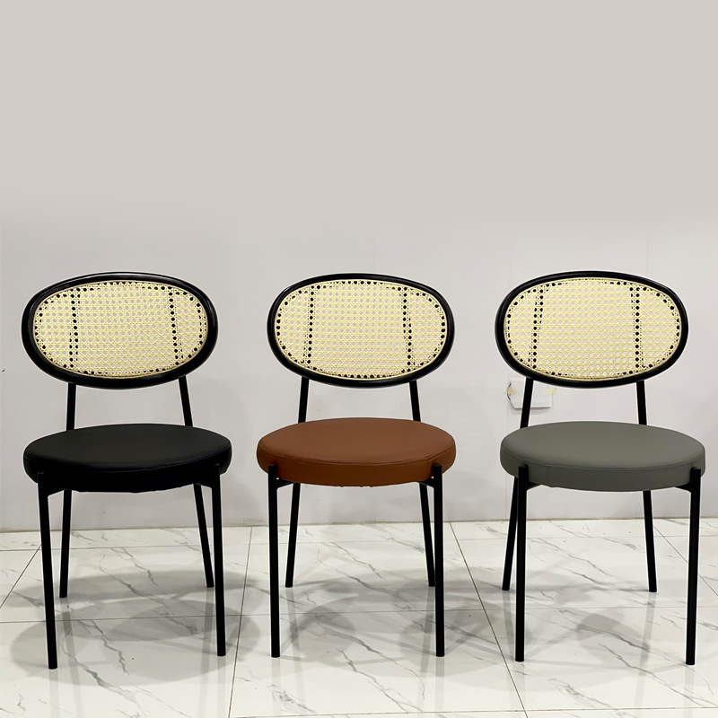 - Chất liệu: Tựa ghế gỗ ash sơn đen mờ, mặt tựa mây lưới, đệm bọc da (vải), khung thép sơn tĩnh điện đen