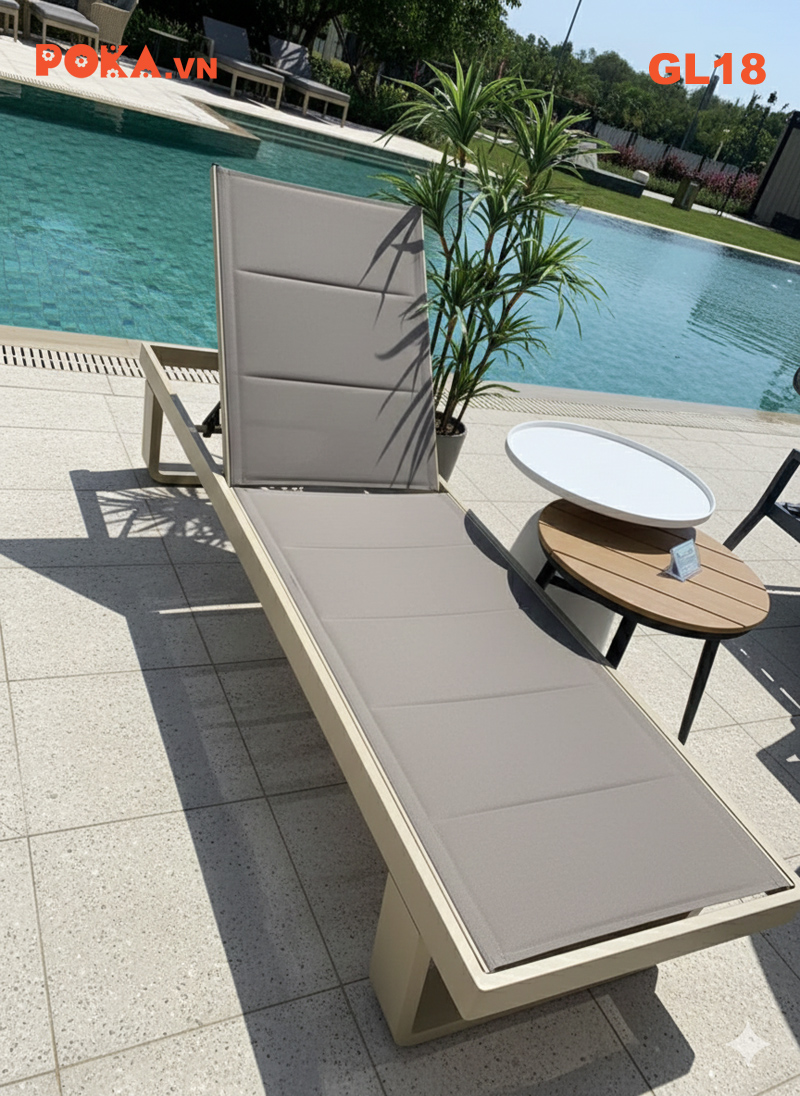 Ghế nằm thư giãn GL18 được đặt cạnh hồ bơi ở các khu nghỉ dưỡng, resort, khách sạn.