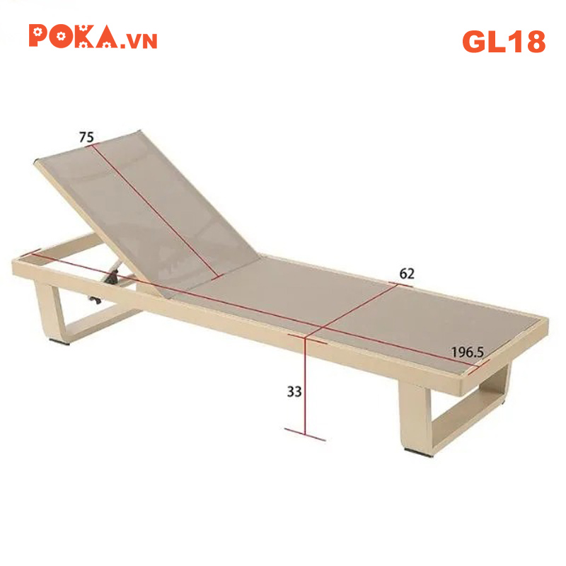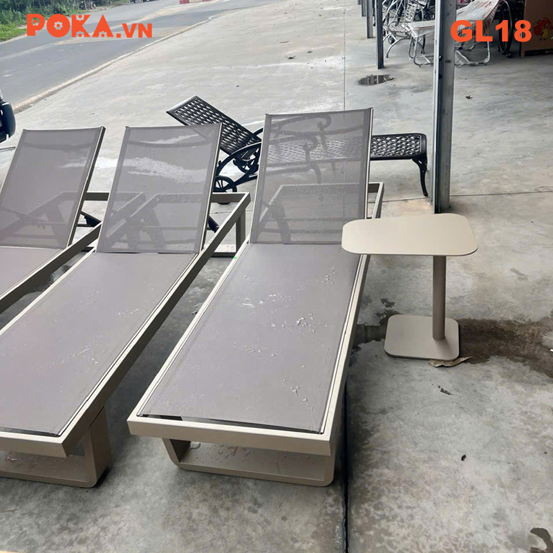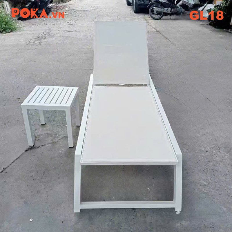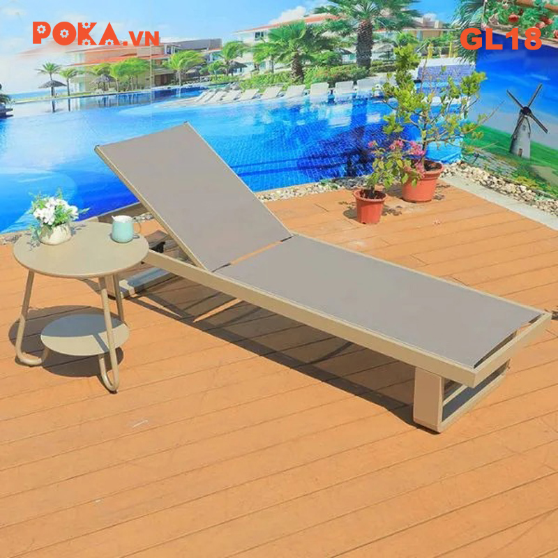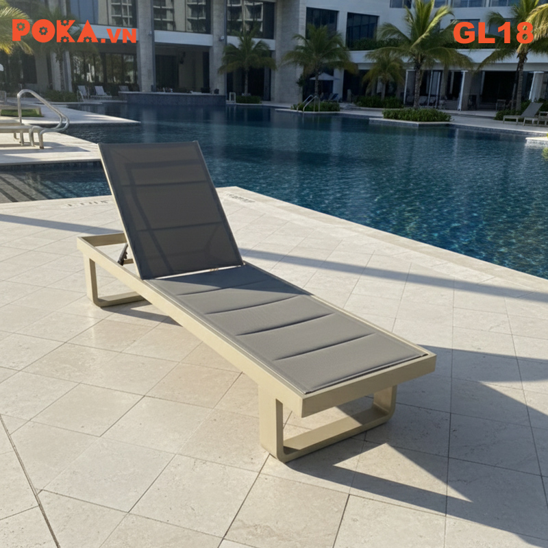 Ghế tắm nắng cao cấp nhôm lưới textilene GL18 được cấu tạo từ hợp kim nhôm siêu bền, kết hợp với chất liệu vải textilene vừa có độ đàn hồi cao, thoáng mát.
