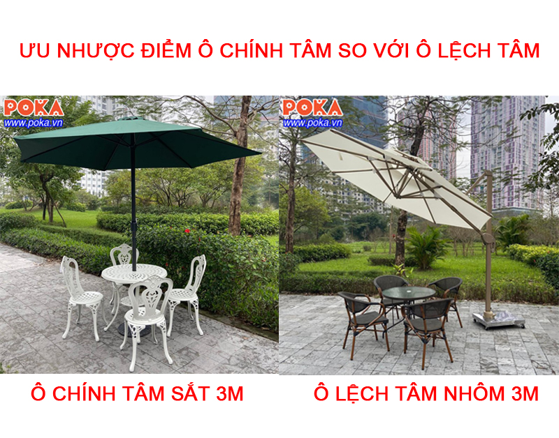 Nhược điểm ô dù đứng tâm: nhược điểm duy nhất của mẫu ô này chính là không gian sử dụng trong lòng ô, vì là chính tâm nên ở giữa là cán ô nên chỉ có thể sử dụng cho một số loại bàn ghế ngoài trời có lỗ để cắm cán ô xuyên qua, hoặc 1 vài mẫu bàn ghế loại nhỏ khác.