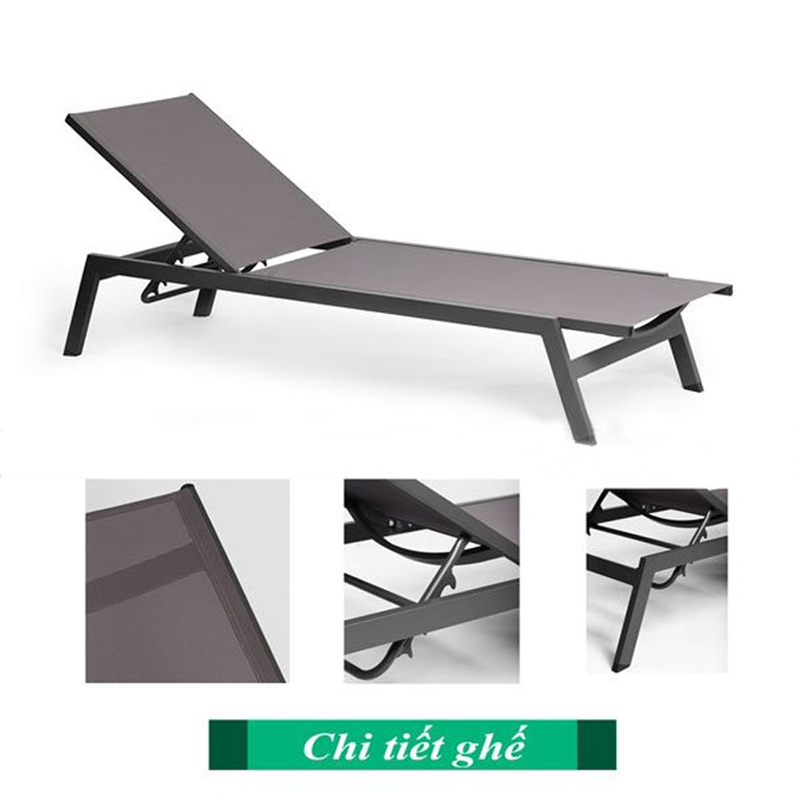 Giường tắm nắng (sunlounger) được cấu tạo từ hợp kim nhôm định hình siêu nhẹ và phủ bằng sơn tĩnh điện, bề mặt nằm được đan bởi lớp vải lưới Textilene siêu bền và đàn hồi cao.