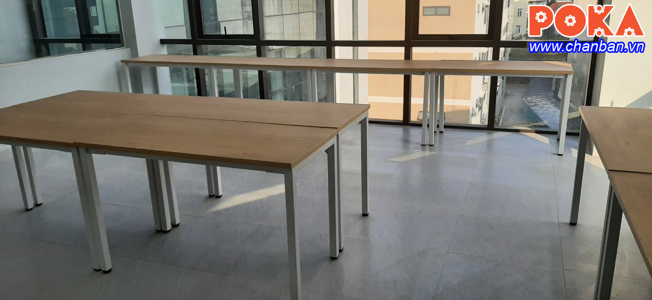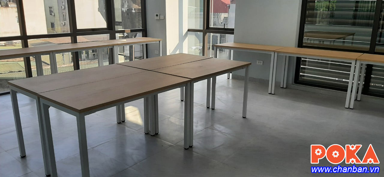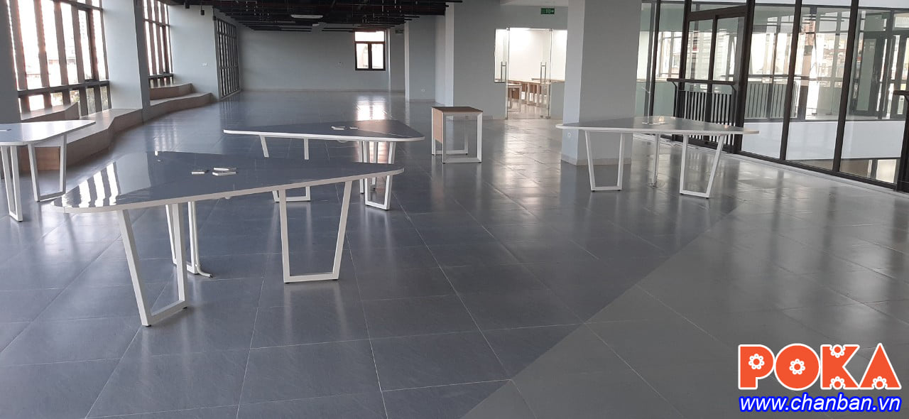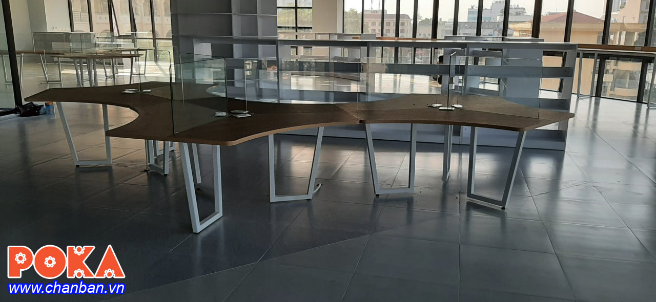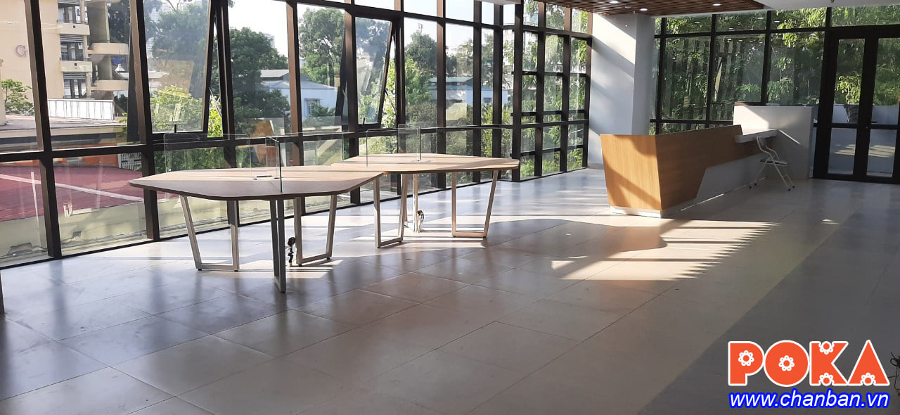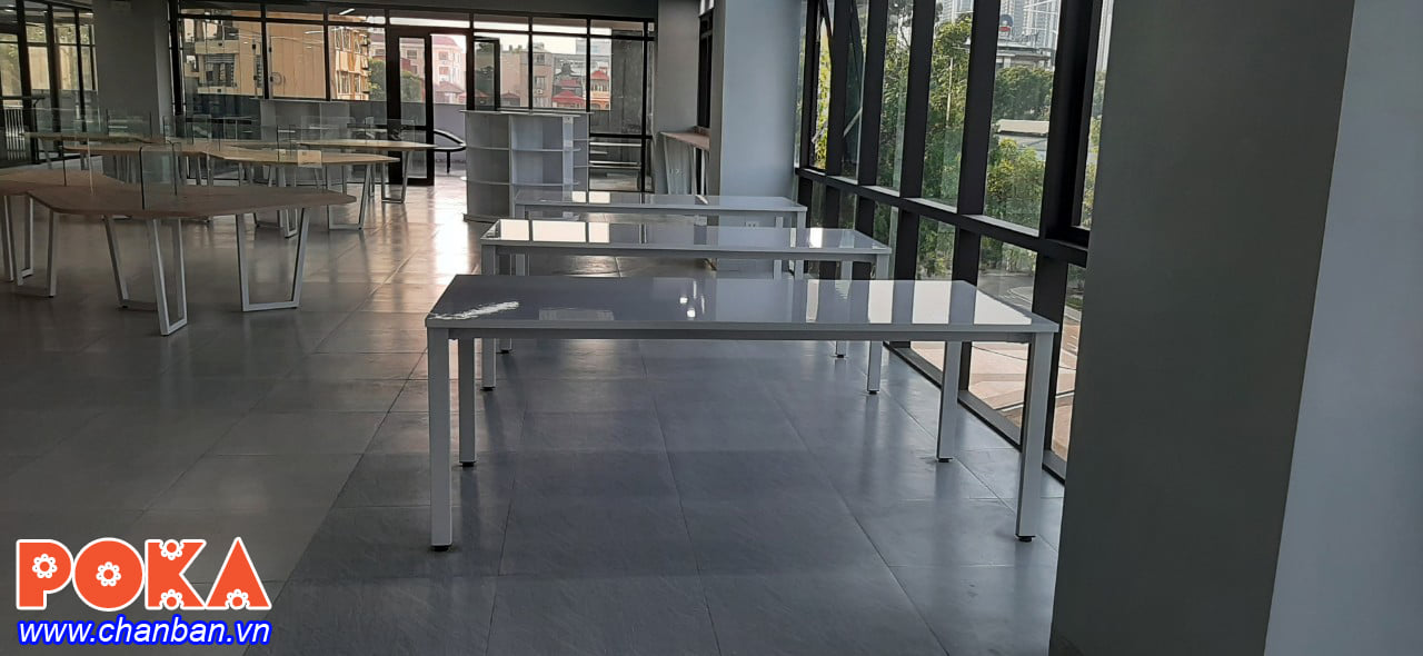 Hệ bàn cụm 3 được liên kết lại với nhau, tạo nên một không gian gần gũi thân thiện, các bạn sinh viên được giữ khoảng cách với nhau bằng vách kính. Đây là hệ bàn chiếm nhiều nhất trong công trình, toàn bộ chân bàn và khung đỡ mặt bàn làm bằng thép hộp 30x60mm, chân bàn và khung đỡ mặt bàn được liên kết với nhau bằng bulong rất chắc chắn