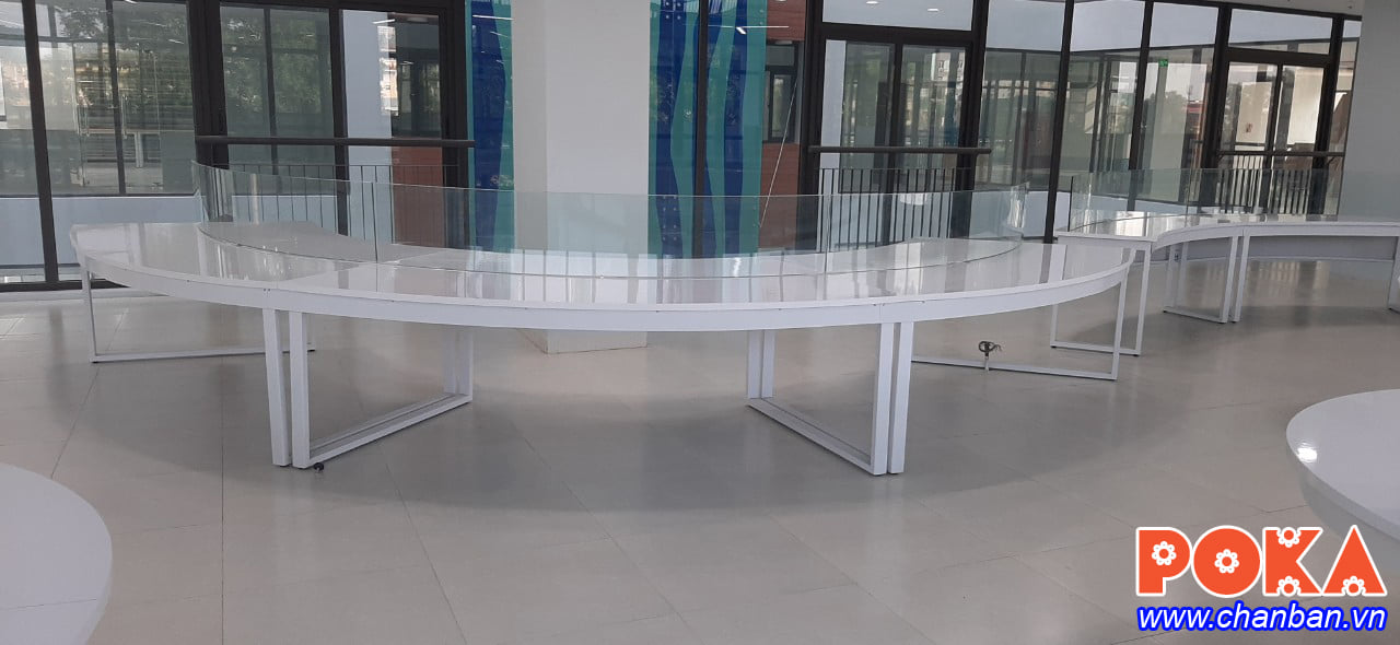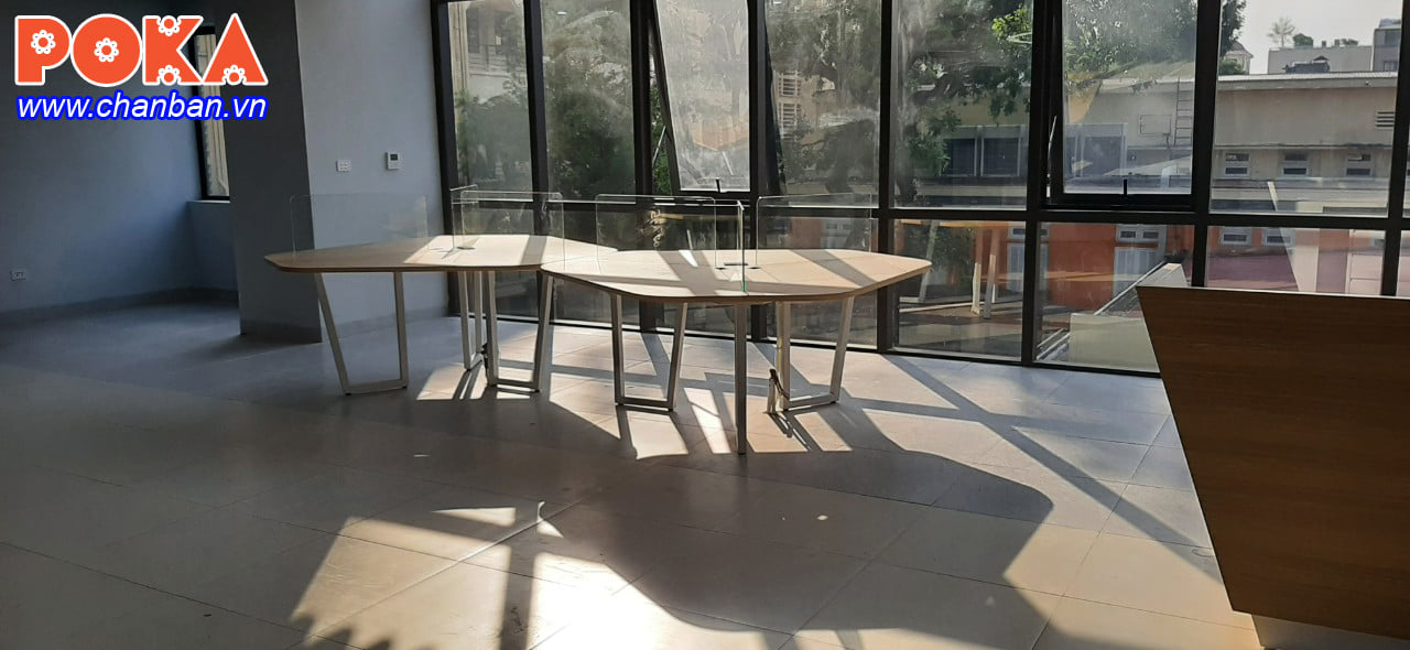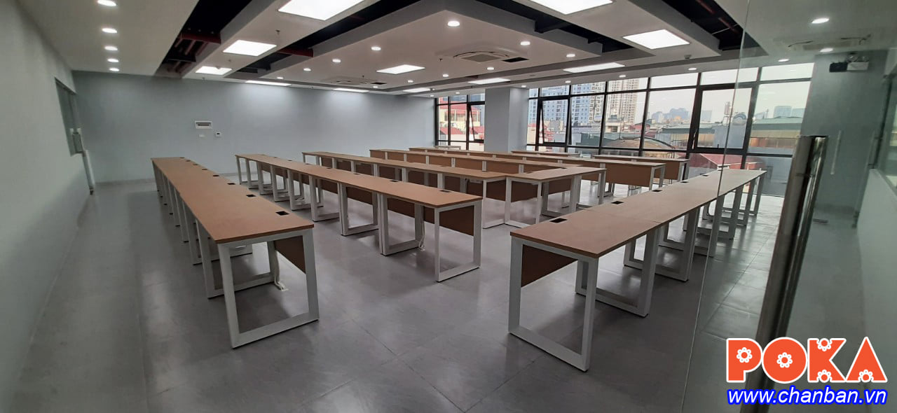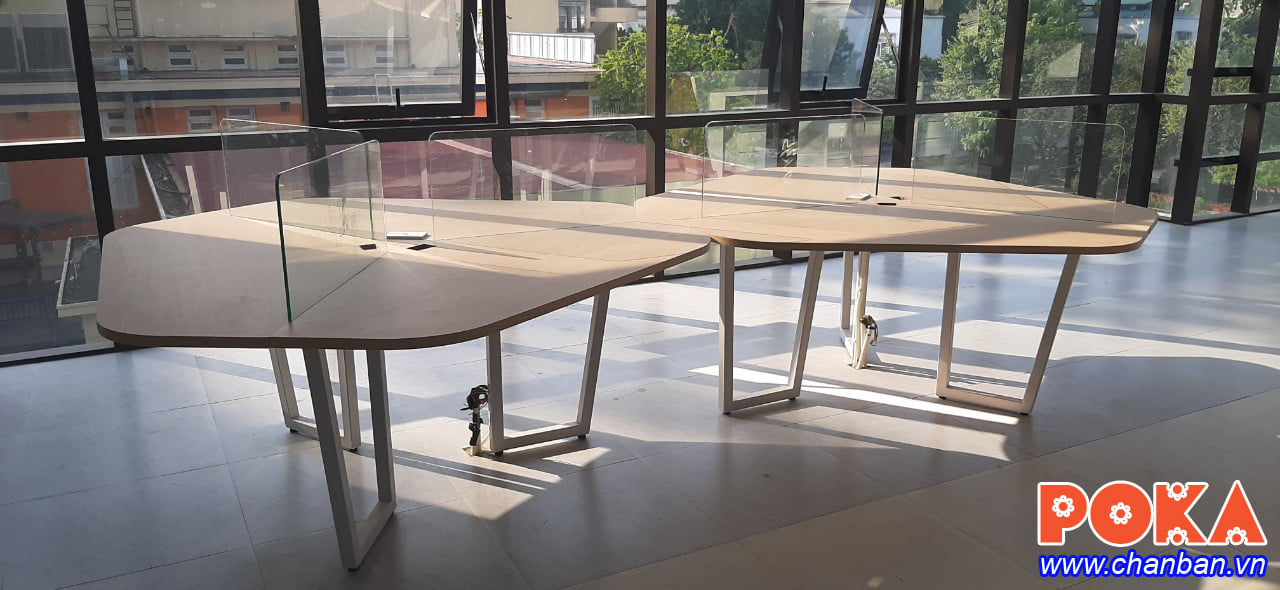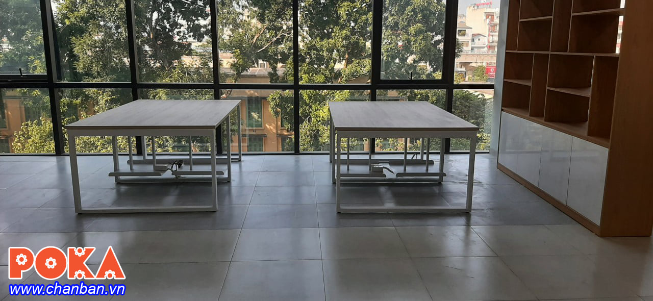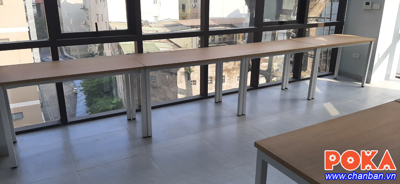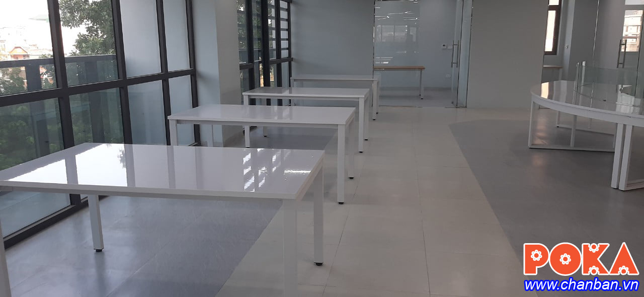 Hệ bàn cụm 3 được liên kết lại với nhau, tạo nên một không gian gần gũi thân thiện, các bạn sinh viên được giữ khoảng cách với nhau bằng vách kính. Đây là hệ bàn chiếm nhiều nhất trong công trình, toàn bộ chân bàn và khung đỡ mặt bàn làm bằng thép hộp 30x60mm, chân bàn và khung đỡ mặt bàn được liên kết với nhau bằng bulong rất chắc chắn