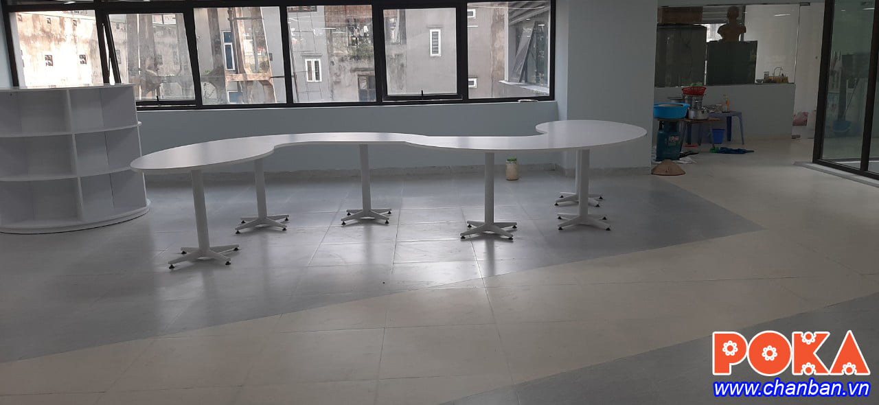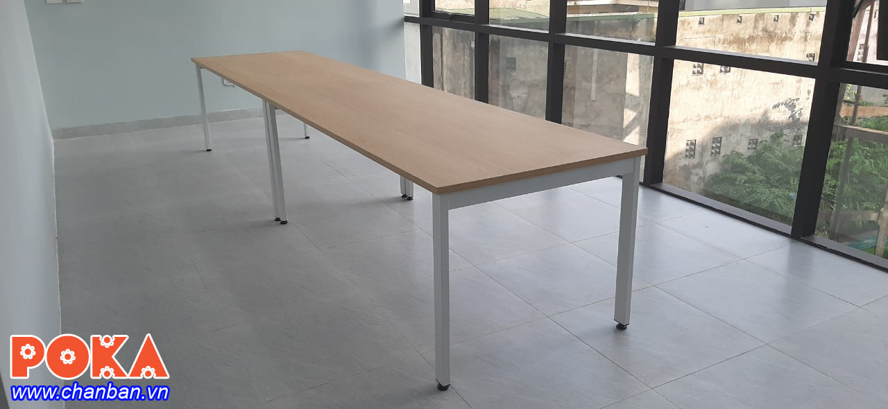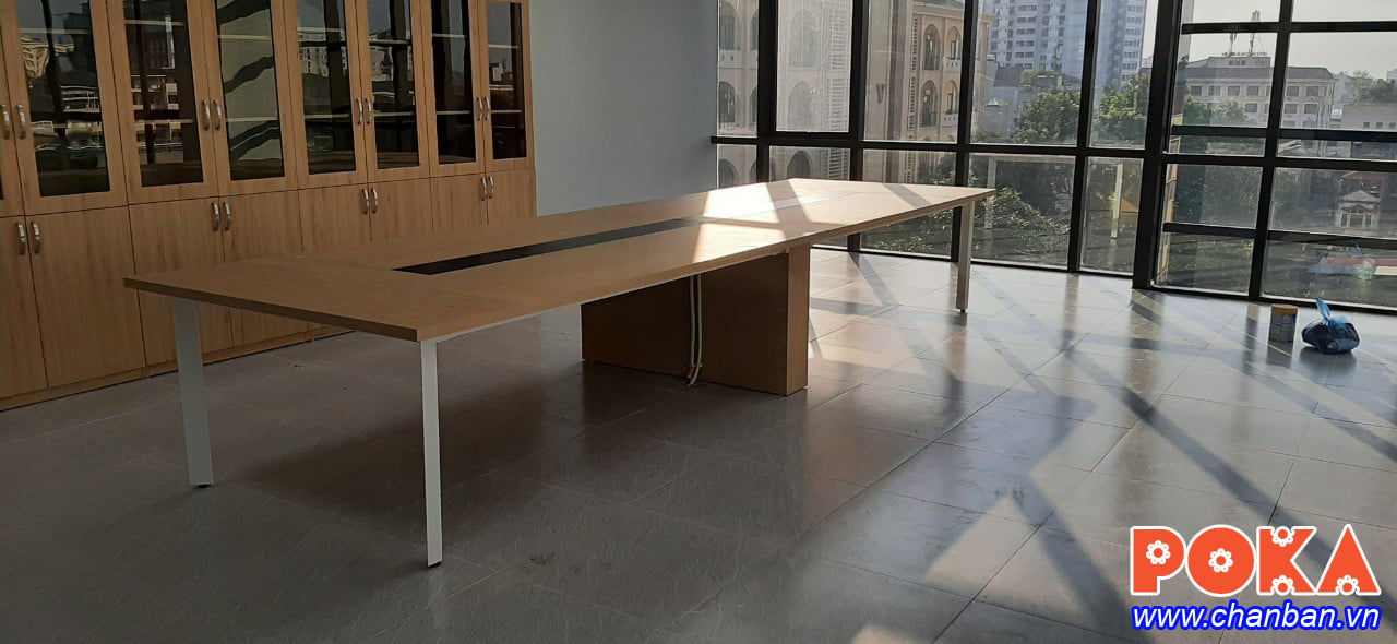 Bàn họp làm bằng chân bàn ống tam giác, giữa bàn có hộp gỗ kỹ thuật tăng kết cấu vững chắn