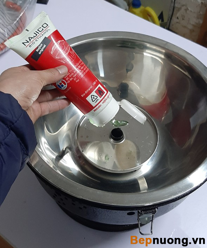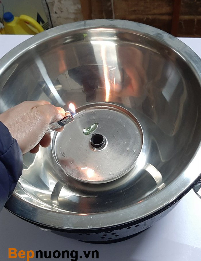 - Khi đổ cồn nhão vào khay đỡ bầu đốt, ta nên đổ vừa phải tránh trường hợp đổ ít quá không đủ lửa để mồi than.