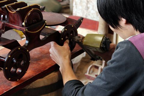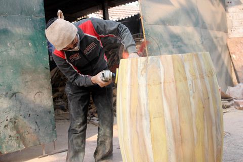 Để làm được một chiếc trống rượu vang phải trải qua rất nhiều công đoạn. Trước tiên, phải cưa gỗ để đóng thùng, bào nhẵn, gắn keo các khớp nối gỗ và đóng nắp cho bom rượu. Cuối cùng, chúng sẽ được phun một lớp sơn phun bóng và mang đi phơi.