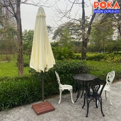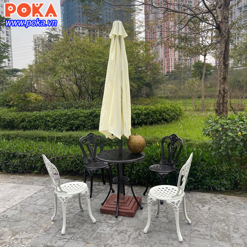 Ảnh 2: Bàn ghế nhôm đúc kết hợp với Ô dù cafe đứng tâm sắt 3m màu trắng
