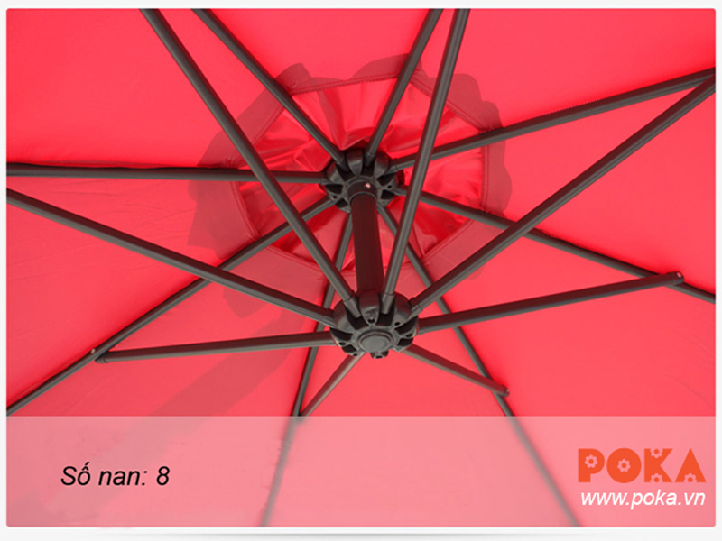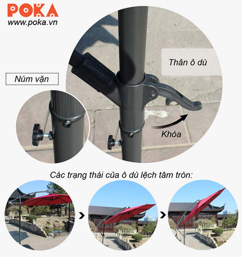 - Ô dù lệch tâm tròn có tay quay điều chỉnh độ mở rộng của ô.