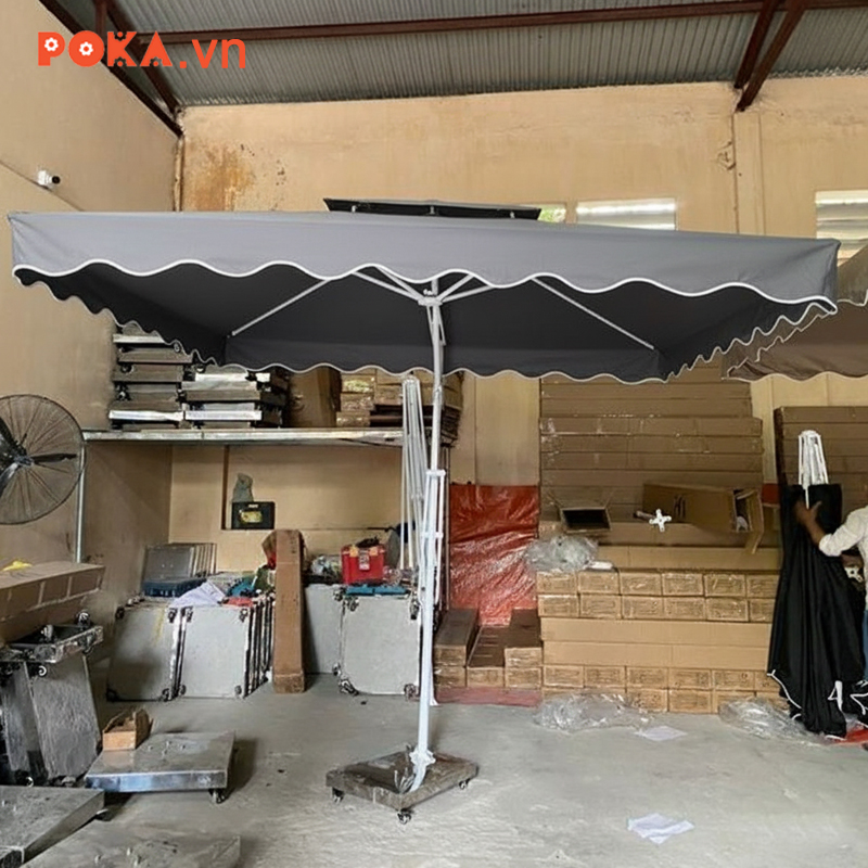 POKA chuyên sản xuất và phân phối bán sỉ và lẻ sản phẩm Ô dù cà phê lệch tâm vuông 2.5x2.5m màu ghi xám. Ô lệch tâm vuông che nắng mưa và trang trí cho Quán Cafe, nhà hàng, khách sạn, sân golf, Resort, bể bơi, trường học...