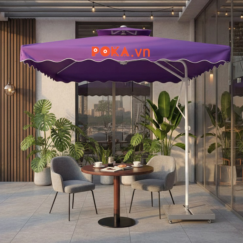 POKA chuyên sản xuất và phân phối bán sỉ và lẻ sản phẩm Ô dù cà phê lệch tâm vuông 2.5x2.5m màu tím. Ô lệch tâm vuông che nắng mưa và trang trí cho Quán Cafe, nhà hàng, khách sạn, sân golf, Resort, bể bơi, trường học...