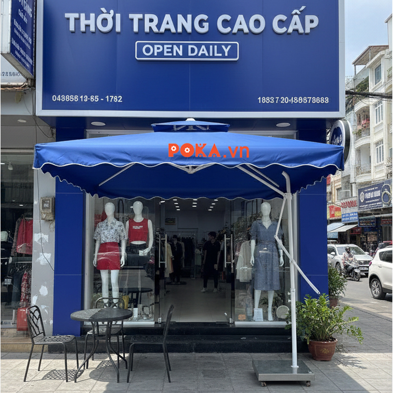 Ảnh 3: Một số hình ảnh chi tiết của Ô dù lệch tâm vuông màu xanh nước biển dùng cho cửa hàng thời trang với concept là chủ đạo màu xanh