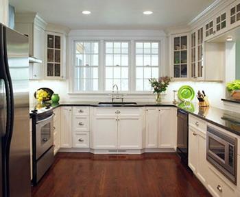 Để tạo sự cân bằng, hài hòa với sàn gỗ tối màu, bạn nên chọn tủ bếp có màu sắc tươi sáng, tốt nhất là màu trắng, khi kết hợp với màu sàn sẽ khiến căn bếp nổi bật hơn. Cách phối màu này phù hợp với những người yêu thích sự thanh lịch, sang trọng và ưa sạch sẽ.